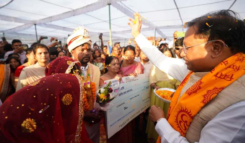 मुख्यमंत्री विष्णु देव साय ने मुख्यमंत्री कन्या विवाह योजना के अंतर्गत हसौद में परिणय-सूत्र में बंधने वाले 140 नवविवाहित जोड़ों को शुभकामनाएँ और आशीर्वाद दिया।