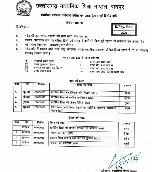 हाईस्कूल सर्टिफिकेट परीक्षा 21 फरवरी 2026 से 13 मार्च 2026 तक प्रातः 9 बजे से 12.15 बजे तक संपन्न होगी। इसी प्रकार शारीरिक प्रशिक्षण पत्रोपाधि परीक्षा (प्रथम एवं द्वितीय वर्ष) 20 फरवरी 2026 से 28 फरवरी 2026 तक प्रातः 9 बजे से 12.15 बजे तक आयोजित की जाएगी। विस्तृत समय-सारणी मण्डल की आधिकारिक वेबसाइट www.cgbse.nic.in पर उपलब्ध है।