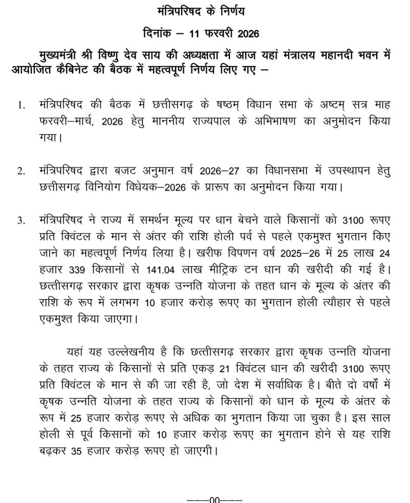 (छत्तीसगढ़ प्रयाग न्यूज) :– मुख्यमंत्री विष्णुदेव साय की अध्यक्षता में 11 फरवरी 2026 को मंत्रालय महानदी भवन में मंत्रिपरिषद की बैठक संपन्न हुई। बैठक में आगामी विधानसभा सत्र और किसानों से जुड़े अहम प्रस्तावों को स्वीकृति प्रदान की गई।