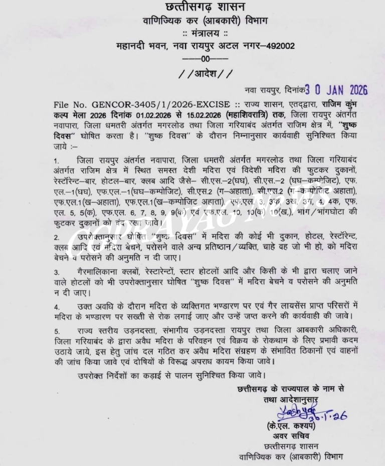 (छत्तीसगढ़ प्रयाग न्यूज) :– राज्य शासन द्वारा राजिम कुंभ कल्प मेला 2026 के अवसर पर मेला क्षेत्र में शांति, सुरक्षा एवं धार्मिक मर्यादा बनाए रखने के उद्देश्य से शुष्क दिवस घोषित किया गया है। जारी आदेश के अनुसार 01 फरवरी 2026 से 15 फरवरी 2026 (महाशिवरात्रि) तक जिला रायपुर अंतर्गत नवापारा, जिला धमतरी अंतर्गत मगरलोड तथा जिला गरियाबंद अंतर्गत राजिम क्षेत्र को शुष्क दिवस क्षेत्र घोषित किया गया है।