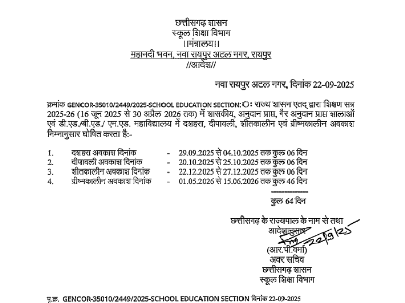 (छत्तीसगढ़ प्रयाग न्यूज) :– छत्तीसगढ़ लोक शिक्षण संचालनालय द्वारा शिक्षा सत्र 2025 -26 के दौरान प्रदेश के शैक्षणिक संस्थानों में दशहरा, दीपावली, शीतकालीन तथा ग्रीष्म अवकाश की घोषणा कर दी गई है। इस दौरान कुल 64 दिन की छुट्टियां मिलेगी। विभाग द्वारा जारी आदेश अनुसार दशहरा में 6 दिवस, दीपावली में 6 दिवस, शीतकालीन में 6 और ग्रीष्म में 46 दिनों की छुट्टी रहेगी। इस संबंध में अवर सचिव ने आदेश जारी किया है।
