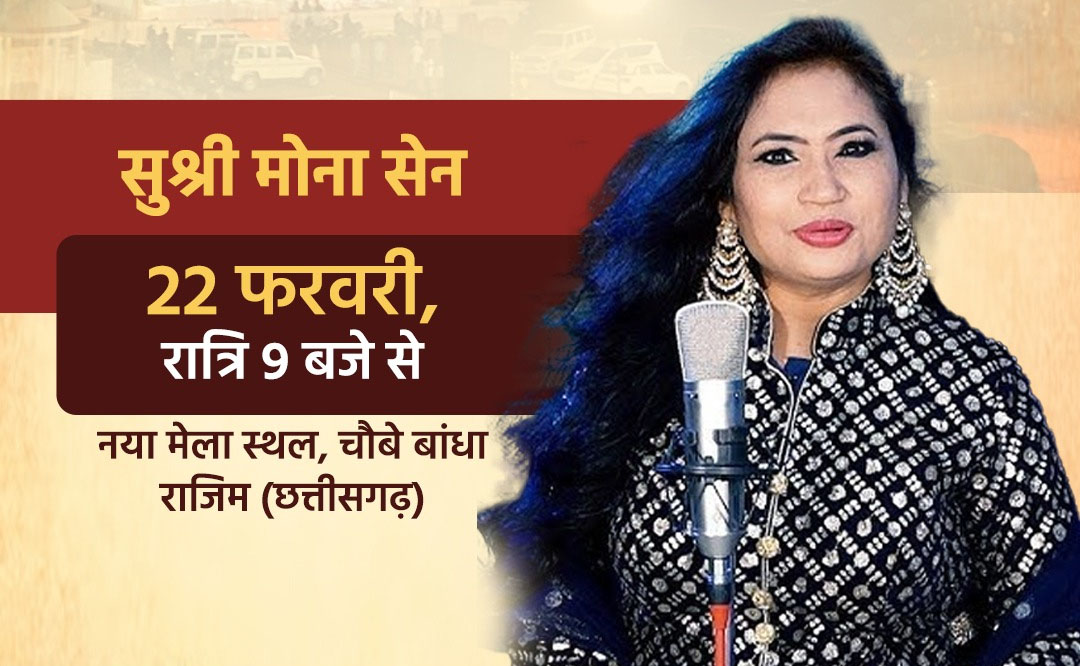 (छत्तीसगढ़ प्रयाग न्यूज) :– राजिम कुंभ कल्प मेला में 22 फरवरी शनिवार को मुख्यमंच में संध्याकालीन संत समागम में संतों का आशीर्वचन प्राप्त होगा। इसके पश्चात छत्तीसगढ़ की प्रसिद्ध लोक गायिका मोना सेन छत्तीसगढ़ी गीतों से अपनी शानदार प्रस्तुति देंगी।