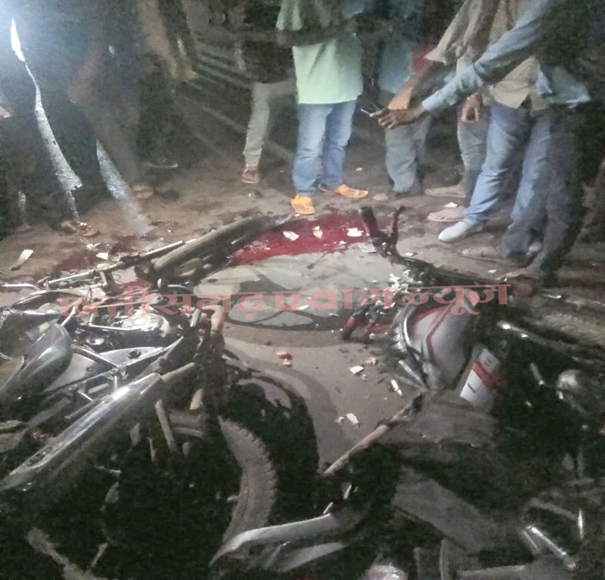 (छत्तीसगढ़ प्रयाग न्यूज) :– नवापारा-मगरलोड मार्ग पर गुरुवार की रात दो बाइकों की आमने-सामने जबरदस्त भिड़ंत हो गई। इस दर्दनाक हादसे में दो जवान युवकों की मौके पर ही मौत हो गई, जबकि एक अन्य युवक गंभीर रूप से घायल बताए जा रहे हैं। हादसा इतना भयावह था कि दोनों बाइकों के परखच्चे उड़ गए और सड़क खून से लथपथ हो गई। घटना धमतरी जिले के मगरलोड थाना क्षेत्र की है।