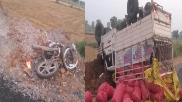 राजिम में पिकअप और बाइक की जोरदार भिड़ंत, हादसे के बाद पिकअप पलटा
