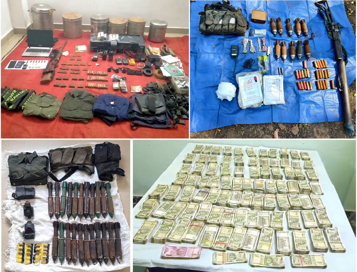 बरामद सामग्री में 46,31,500 रुपये नकद (छियालिस लाख इकत्तीस हजार पांच सौ रुपये), 1 भरमार बंदूक, 33 भरमार राउंड, 1 सुरका रायफल, 32 बीजीएल सेल, 1 लैपटॉप, 2 मोबाइल फोन, 10 इंसास राउंड, 11 एसएलआर राउंड, 45 एके-47 राउंड, 41 नग .303 राउंड, 23 सिंगल शॉट राउंड, 26 नग 12 बोर राउंड, 13 इलेक्ट्रॉनिक व 10 नॉन-इलेक्ट्रॉनिक डेटोनेटर सहित भारी मात्रा में नक्सली साहित्य एवं अन्य सामग्री शामिल है।
