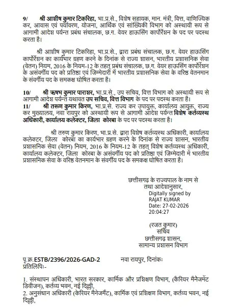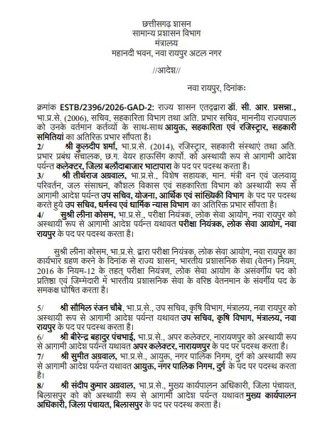 (छत्तीसगढ़ प्रयाग न्यूज) :– राज्य सरकार ने बड़ा प्रशासनिक फेरबदल करते हुए 11 आईएएस अधिकारियों के प्रभार में बदलाव किया है। पदोन्नति के बाद कुछ अधिकारियों को नई जिम्मेदारी सौंपी गई है, जबकि कई अधिकारियों को उनके वर्तमान पद पर यथावत रखा गया है। सामान्य प्रशासन विभाग द्वारा यह आदेश जारी किया गया है।