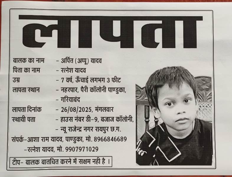 मिली जानकारी के अनुसार 7 वर्षीय अर्पित यादव रायपुर से तीज के त्योहार पर अपने नाना के घर पांडुका पहुंचा था। कल शाम 26 अगस्त को अर्पित खेलते खेलते घर के गेट से बाहर निकल गया। उसके बाद से उसका कुछ पता नहीं चला है। घर वालों ने काफी खोज बिन की और जब नहीं मिला तो पांडुका थाने में रात 8 बजे बच्चे के नाना ने गुमशुदगी की रिपोर्ट दर्ज की है।