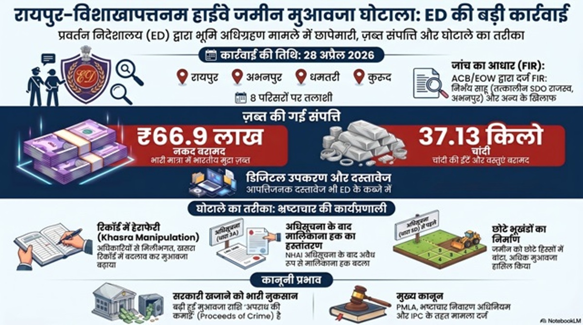(छत्तीसगढ़ प्रयाग न्यूज) :– प्रवर्तन निदेशालय (ईडी) के रायपुर जोनल कार्यालय ने मंगलवार, 28 अप्रैल 2026 को रायपुर-विशाखापटनम हाईवे परियोजना (भारतमाला योजना) के तहत जमीन अधिग्रहण में हुए बड़े मुआवजे घोटाले के सिलसिले में छत्तीसगढ़ के 8 ठिकानों पर तलाशी अभियान चलाया। कार्यवाही के दौरान भारी मात्रा में नकदी और चांदी जब्त की गई है।