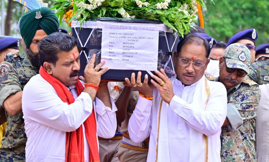 मुख्यमंत्री ने नक्सल मुठभेड़ में शहीद जवान मेहुल भाई को दी श्रद्धांजलि, पार्थिव शरीर को कंधा देकर दी अंतिम विदाई