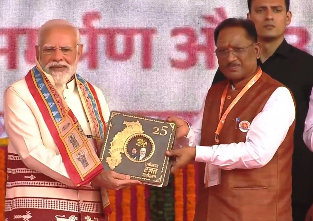 (छत्तीसगढ़ प्रयाग न्यूज) :– छत्तीसगढ़ राज्य स्थापना की 25वीं वर्षगांठ के अवसर पर आयोजित राज्योत्सव कार्यक्रम में प्रधानमंत्री नरेंद्र मोदी ने ‘कोसा कॉफ़ी टेबल बुक’ का विमोचन किया। जनसंपर्क विभाग का यह विशेष प्रकाशन प्रधानमंत्री श्री मोदी के मार्गदर्शन में छत्तीसगढ़ में हुए जन-कल्याणकारी कार्यों और विकास यात्रा का विस्तृत दस्तावेज़ प्रस्तुत करता है।