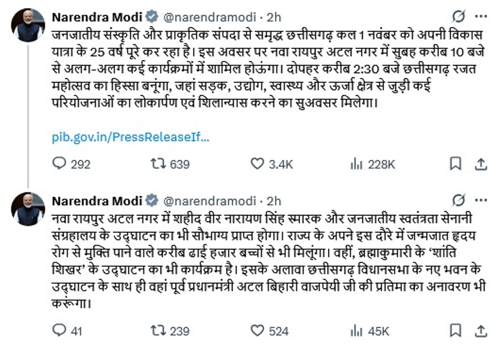 प्रधानमंत्री श्री मोदी ने सोशल मीडिया प्लेटफार्म ‘एक्स’ पर पोस्ट किया कि जनजातीय संस्कृति और प्राकृतिक संपदा से समृद्ध छत्तीसगढ़ 1 नवंबर को अपनी विकास यात्रा के 25 वर्ष पूरे कर रहा है। इस अवसर पर नवा रायपुर अटल नगर में सुबह से अलग-अलग कई कार्यक्रमों में शामिल होऊंगा। दोपहर करीब 2:30 बजे छत्तीसगढ़ रजत महोत्सव का हिस्सा बनूंगा, जहां सड़क, उद्योग, स्वास्थ्य और ऊर्जा क्षेत्र से जुड़ी कई परियोजनाओं का लोकार्पण एवं शिलान्यास करने का सुअवसर मिलेगा। नवा रायपुर अटल नगर में शहीद वीर नारायण सिंह स्मारक और जनजातीय स्वतंत्रता सेनानी संग्रहालय के उद्घाटन का भी सौभाग्य प्राप्त होगा।