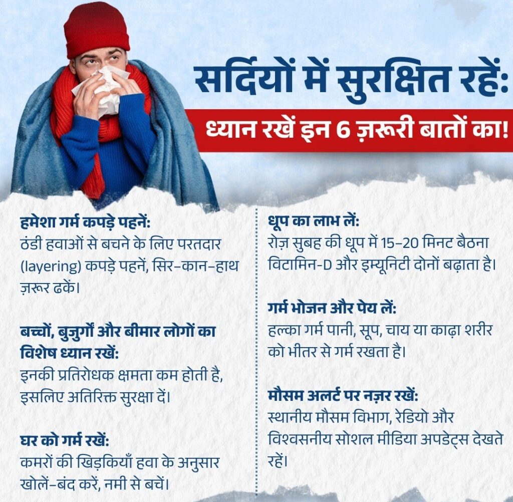 प्रदेश में बढ़ते ठंड और शीतलहर को देखते हुए आमजन की सुरक्षा के लिए स्वास्थ्य विभाग द्वारा जरूरी एहतियाती दिशा निर्देश जारी किए गए हैं। स्वास्थ्य विभाग के अधिकारियों ने बताया कि शीतलहर के दौरान लोग अनावश्यक घर से बाहर न निकलें और यात्रा से यथासंभव बचें। ठंड से बचाव के लिए गर्म कपड़ों का उपयोग करें और शरीर को गर्म रखने के लिए गर्म तरल पदार्थाे का सेवन लगातार करते रहें। यदि किसी व्यक्ति को अत्यधिक कंपकंपी, उंगलियों में पीलापन या सफेदपन, सुन्नता जैसे लक्षण दिखाई दें तो तुरंत चिकित्सक से संपर्क करें। उन्होंने विशेष रूप से बच्चों और बुजुर्गाे को इस मौसम में अतिरिक्त सावधानी बरतने की सलाह दी।