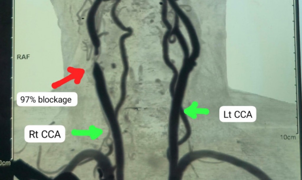 मरीज को पिछले दो वर्षों से बार-बार लकवा, चक्कर, एक आंख से धुंधला दिखना और सुनाई न देने जैसी समस्याएं हो रही थीं। प्रारंभिक जांच के बाद कैरोटिड सीटी एंजियोग्राफी कराई गई, जिसमें पता चला कि मरीज की दाहिनी कैरोटिड आर्टरी में 95% से अधिक रुकावट थी। इससे मस्तिष्क को रक्त की आपूर्ति बाधित हो रही थी।