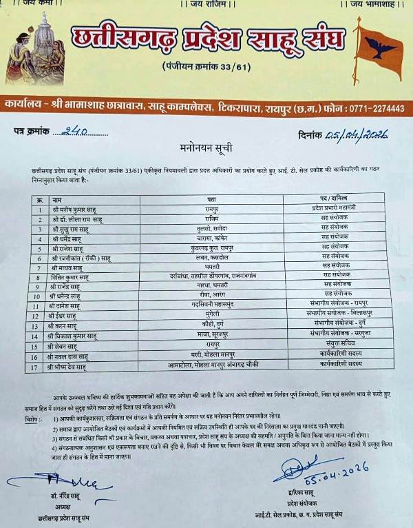 उन्होंने कहा कि माता कर्मा, माता राजिम,अपने माता-पिता, गुरुजनों एवं समाज के आशीर्वाद से मिली यह जिम्मेदारी उन्हें और अधिक समर्पण एवं ऊर्जा के साथ समाज सेवा करने की प्रेरणा देती है। इस नियुक्ति पर समाज के वरिष्ठजनों, जनप्रतिनिधियों एवं परिजनों ने हर्ष व्यक्त करते हुए श्री साहू को शुभकामनाएँ दीं तथा उनके उज्ज्वल भविष्य की कामना की।