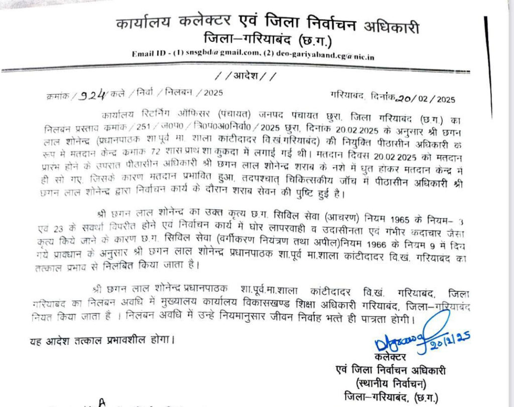 दरअसल, 20 फरवरी को त्रिस्तरीय पंचायत चुनाव के दूसरे चरण का मतदान संपन्न हुआ। गरियाबंद जिले के बूथ केंद्र क्रमांक 72 (शासकीय प्राथमिक शाला, कुकदा) में तैनात पीठासीन अधिकारी छगन लाल शोनेन्द्र मतदान के दौरान शराब के नशे में धुत पाए गए। मतदान प्रक्रिया के प्रारंभ होने के बाद ही शोनेन्द्र नशे की हालत में मतदान केंद्र में सो गए, जिससे मतदान प्रभावित हुआ।