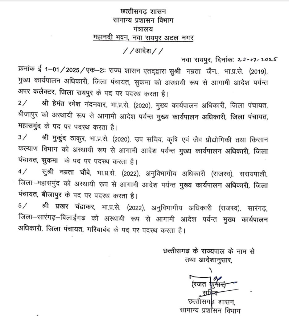 आदेश में मुकुंद ठाकुर को सीईओ जिला पंचायत सुकमा, नम्रता चौबे को सीईओ जिला पंचायत बीजापुर और प्रखर चंद्राकर को सीईओ जिला पंचायत गरियाबंद बनाया गया है। देखिए सूची