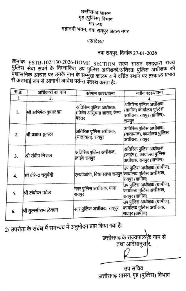 जारी आदेश में अभिषेक कुमार झा अतिरिक्त पुलिस अधीक्षक (विशेष आसूचना शाखा) बस्तर को अतिरिक्त पुलिस अधीक्षक (ग्रामीण) की जिम्मेदारी दी गई है। इसी तरह प्रशांत शुक्ला को अतिरिक्त पुलिस अधीक्षक (यातायात) रायपुर, संदीप मित्तल को अतिरिक्त पुलिस अधीक्षक (क्राइम) रायपुर ग्रामीण, वीरेन्द्र चतुर्वेदी को उप पुलिस अधीक्षक रायपुर (ग्रामीण) लंबोदर पटेल को उप पुलिस अधीक्षक रायपुर (ग्रामीण) और तुलसीराम लेकाम को उप पुलिस अधीक्षक रायपुर (ग्रामीण) बनाया गया है।