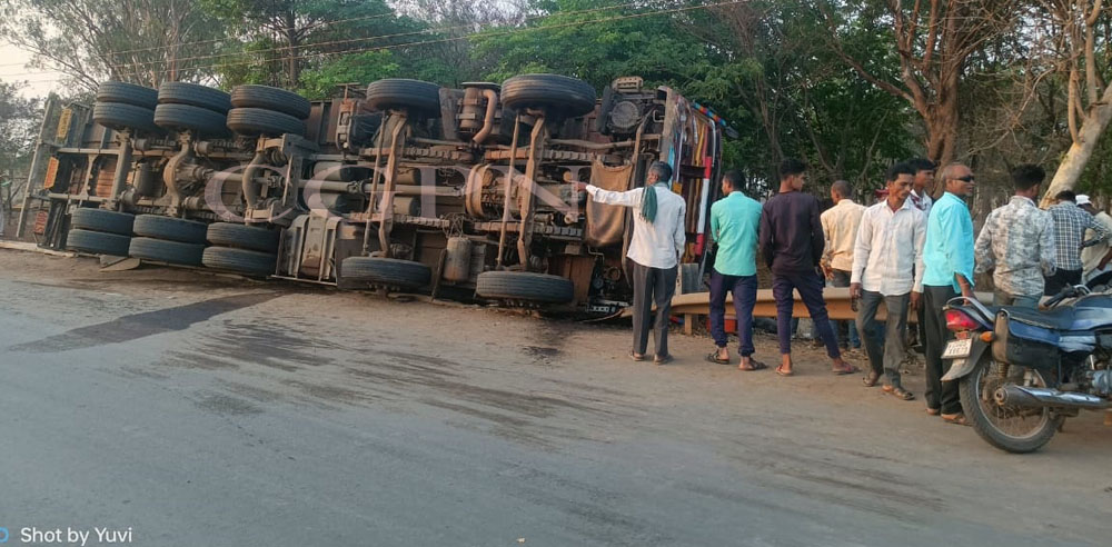 नवापारा ब्रेकिंग: भूसा से भरा तेज रफ्तार ट्रक रेलिंग तोड़ते हुए सड़क किनारे पलटा