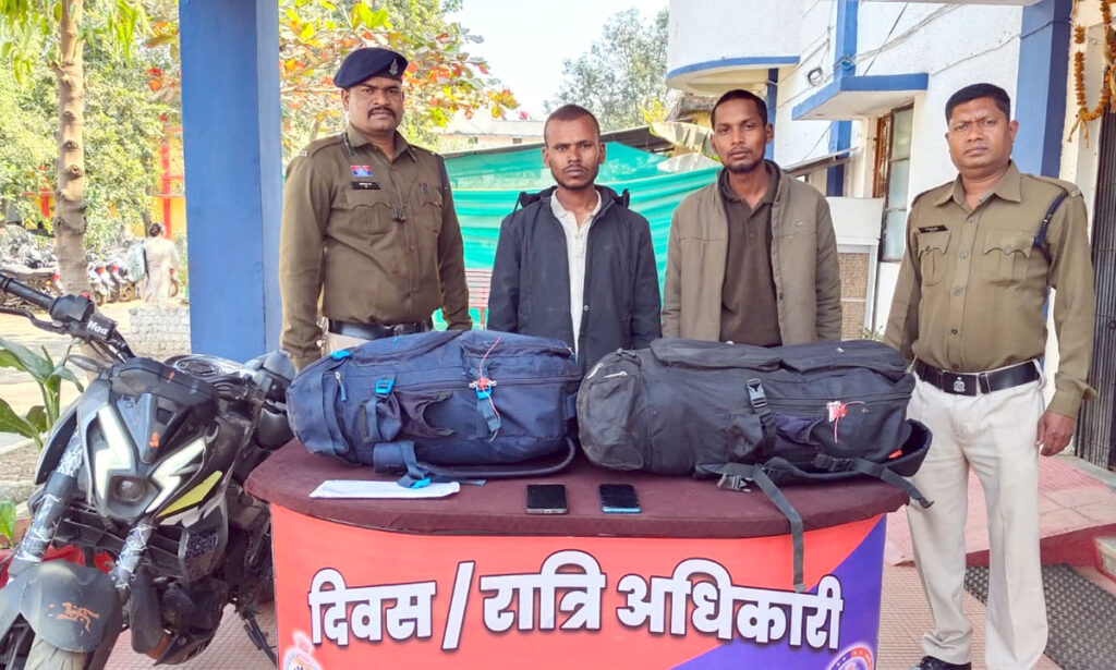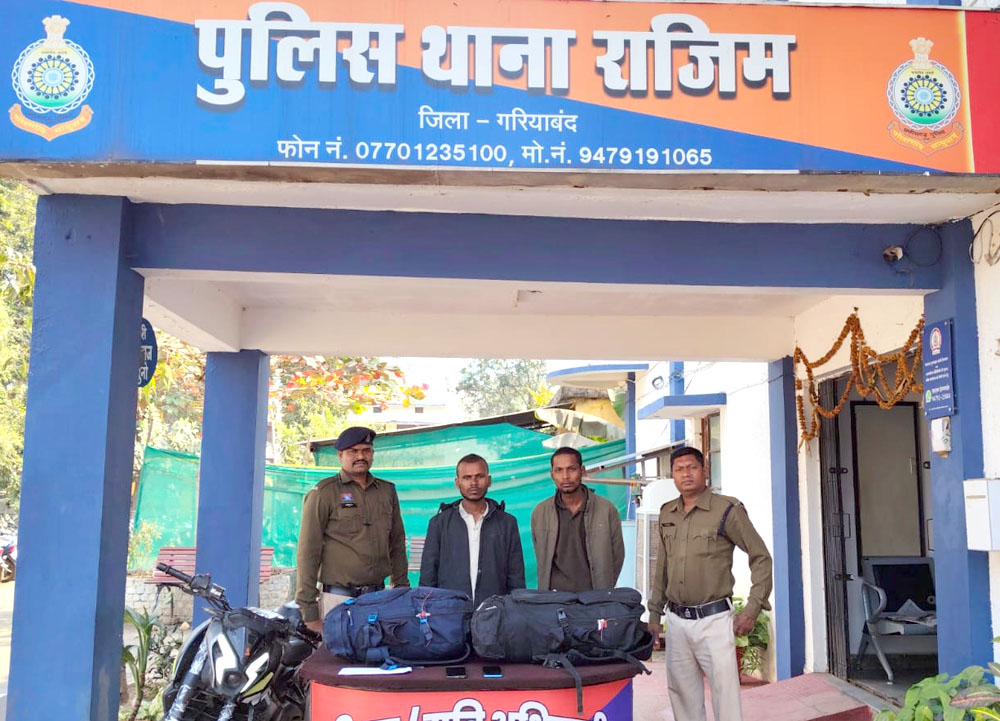(छत्तीसगढ़ प्रयाग न्यूज) :– राजिम पुलिस ने बड़ी मात्रा में अवैध गांजा के साथ दो तस्करों को गिरफ्तार किया है। पुलिस ने आरोपियों के कब्जे से करीब 11 लाख 63 हजार 450 रुपये की अवैध संपत्ति जब्त की है, जिसमें गांजा, बिना नंबर प्लेट की बाइक और मोबाइल फोन शामिल हैं। यह कार्रवाई ऑपरेशन निश्चय के तहत की गई है।
